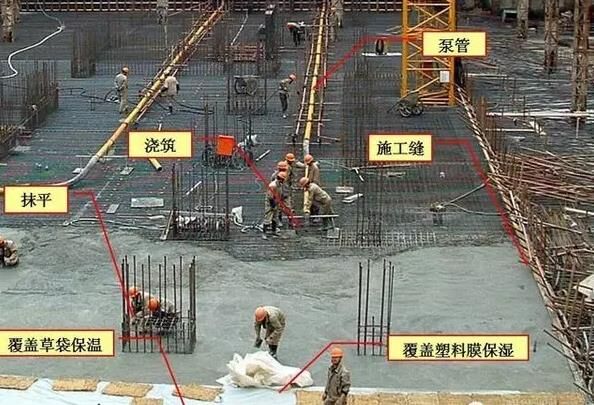 6、大體積泵送混凝土經(jīng)振搗后表面水泥漿較厚,容易引起表面裂縫。首先,要求在振搗最上一層混凝土時,控制振搗時間,注意避免表層產(chǎn)生太厚的浮漿層;在澆搗后,必須及時用2m 長括尺,將多余浮漿層刮除,按照標高控制點,將混凝土表面括拍平整。有凹坑的部位必須用混凝土填平,在混凝土收漿接近初凝時,混凝土面進行二次抹光,用木蟹全面仔細打抹兩遍,既要確保混凝土的平整度,又要把其初期表面的收縮脫水細縫閉合,在混凝土收漿凝固施工期間,除了具體施工人員外,不得在未干硬的混凝土面上隨意行走,收漿工作完成的面必須同步及時覆蓋薄膜。