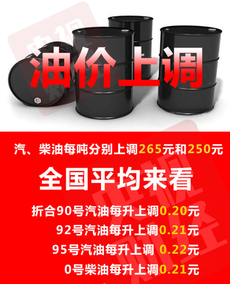 此次油價調整具體為:每噸汽油上調265元、柴油上調250元。