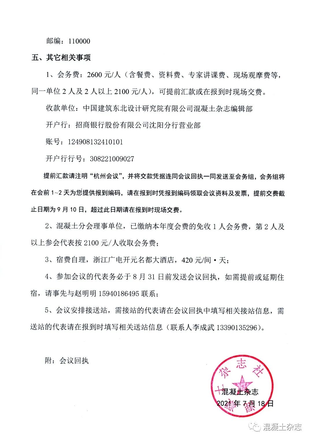 匯款用途:提前匯款請注明“杭州會議”,并將交款憑據(jù)連同會議回執(zhí)一同發(fā)送至?xí)?wù)組,會務(wù)組將在會前1~2天為您提供報到編碼,請在報到時憑報到編碼領(lǐng)取會議資料及發(fā)票,提前交費截止日期為9月10日,超過此日期請在報到時現(xiàn)場交費。