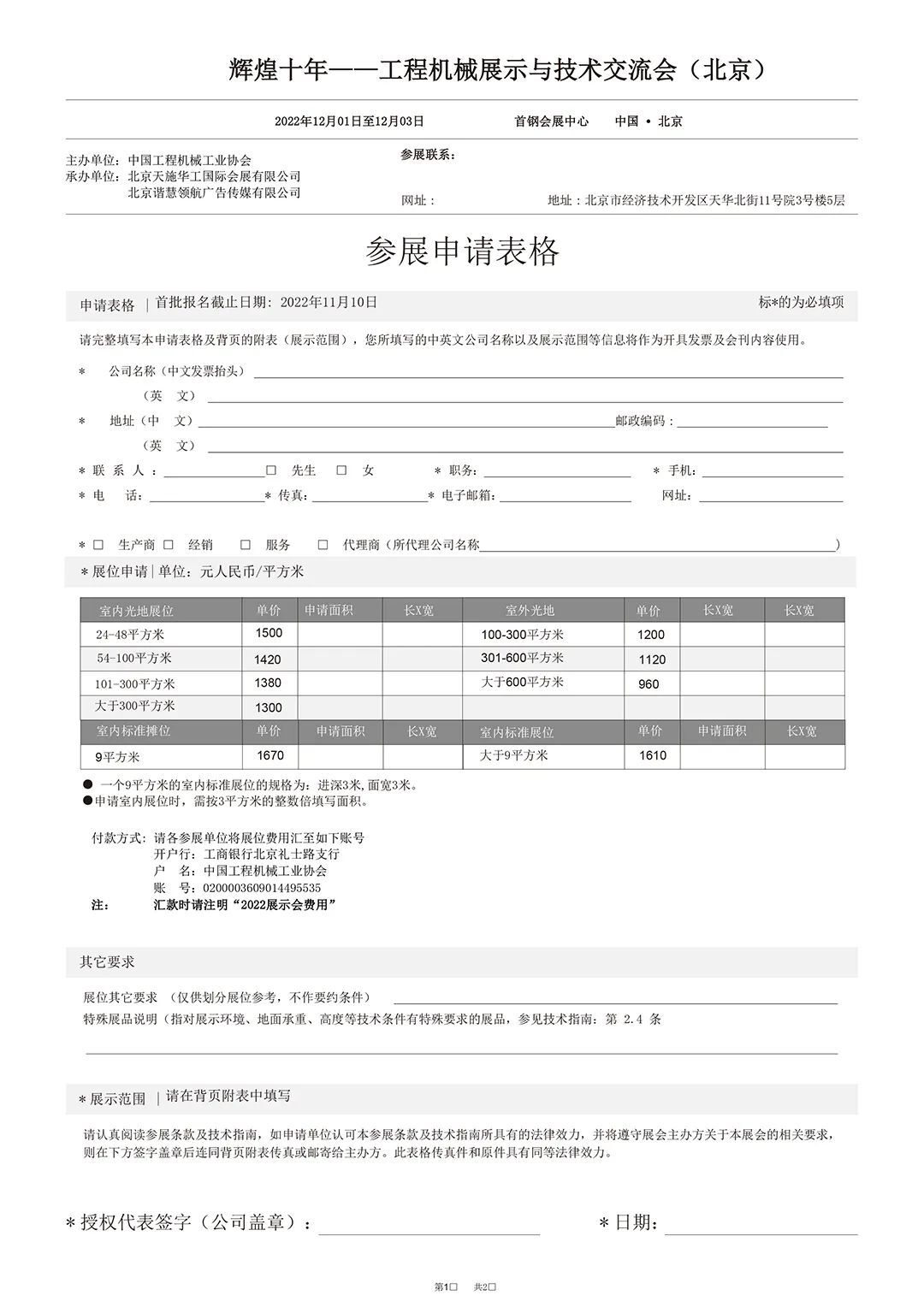 自協(xié)會(huì)發(fā)布舉辦“輝煌十年——工程機(jī)械展示與技術(shù)交流會(huì)(北京)”(以下簡(jiǎn)稱“展示會(huì)”)通知后,得到了各參展單位的快速響應(yīng)和積極支持,有的已經(jīng)報(bào)名大面積參展,有的正在履行審批程序或來電表示參加展出,組委會(huì)深表衷心感謝!為及時(shí)傳遞展會(huì)信息,服務(wù)好廣大展商,辦好本次展示會(huì),現(xiàn)向廣大展商正式發(fā)出邀請(qǐng),并將有關(guān)展示會(huì)方案說明如下:一、為充分展示黨的十八大以來工程機(jī)械行業(yè)各領(lǐng)域取得的發(fā)展成就,協(xié)會(huì)研究決定召開本次展示會(huì),邀請(qǐng)廣大協(xié)會(huì)會(huì)員和產(chǎn)業(yè)鏈上下游企業(yè)參展,共同分享企業(yè)發(fā)展成就和謀劃行業(yè)美好未來。二、展示會(huì)于2022年12月1日至3日在北京冬奧會(huì)滑雪大跳臺(tái)項(xiàng)目舉辦地——北京首鋼會(huì)展中心舉辦。屆時(shí)協(xié)會(huì)將邀請(qǐng)政府部門、相關(guān)用戶、媒體朋友和廣大觀眾到展示會(huì)現(xiàn)場(chǎng)參觀交流。12月3日(周六)實(shí)施社會(huì)公眾開放日,讓社會(huì)觀眾充分體驗(yàn)工程機(jī)械發(fā)展魅力。三、北京首鋼會(huì)展中心適合舉辦室內(nèi)高品質(zhì)展示會(huì),室外面積有限,而且適合承重較輕的產(chǎn)品展出。組委會(huì)初步規(guī)劃總展出面積2萬平米左右,希望各參展企業(yè)提供產(chǎn)業(yè)鏈上下游的先進(jìn)技術(shù)產(chǎn)品和高端裝備進(jìn)行展出,大型設(shè)備和示范工程應(yīng)用等可通過模型、圖片、視頻等方式展示。展示會(huì)主要目的是系統(tǒng)總結(jié)和全面宣傳十年來行業(yè)企業(yè)發(fā)展成就,參展方式可靈活多樣。四、組委會(huì)設(shè)定報(bào)名截止日期為2022年11月10日,以便統(tǒng)籌組織好運(yùn)輸、布展和活動(dòng)安排,高效推進(jìn)各項(xiàng)運(yùn)營服務(wù)工作,確保展出效果。五、組委會(huì)將展館規(guī)劃為綜合類企業(yè)、專精特新企業(yè)、單項(xiàng)冠軍、高端重器、智能裝備、綠色產(chǎn)品、高端配套、先進(jìn)產(chǎn)業(yè)鏈供應(yīng)鏈等展區(qū),供各參展單位選擇。六、展示會(huì)期間組委會(huì)將舉辦“中國工程機(jī)械行業(yè)高質(zhì)量發(fā)展論壇”及其十多場(chǎng)系列會(huì)議、論壇和展示會(huì)選樹等活動(dòng)。七、為便于展商報(bào)名和有序確定展位,本文隨附發(fā)布“展商報(bào)名表”、“展區(qū)規(guī)劃圖”、“展館示意圖”等,詳見附件。4、會(huì)議活動(dòng)區(qū)示意圖