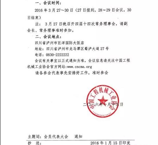 茲定于2016年3月27日~30日在四川瀘州召開“中國工程機(jī)械工業(yè)協(xié)會(huì)第五屆會(huì)員代表大會(huì)暨第十四屆工程機(jī)械發(fā)展高層論壇”。