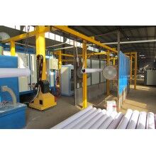 布料機專利設(shè)計的膠帶機頭部清掃器是為輸送混凝土清掃砂漿的特殊要求設(shè)計的。刮刀采用硬質(zhì)合金材料,矩型段面,耐磨且不傷膠帶,砂漿損失小。上料膠帶機設(shè)計為由兩節(jié)輕型桁架的鉸接結(jié)構(gòu),上端鉸接在車架上的轉(zhuǎn)料斗上,通過鉸接油缸根據(jù)需要調(diào)整兩節(jié)桁架之間的角度;在膠帶機的下部,設(shè)計有萬向輪,在油缸的驅(qū)動下可沿桁架軸向移動,可調(diào)整膠帶尾部的高度。