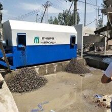 滾筒式砂石分離機主要有導(dǎo)料流槽、內(nèi)外螺旋篩砂滾筒、出石口、溢水槽、噴淋管、驅(qū)動系統(tǒng)、供水系統(tǒng)及控制系統(tǒng)共八個部分組成。當(dāng)殘留混凝土與水進入導(dǎo)料槽后,同時連續(xù)注入循環(huán)水,在水流的沖擊下,混合料漿水流入漿池。清洗過的砂子、石子分別從出砂口和出石口落入料池。流入攪拌池
