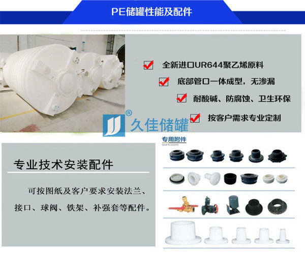 特點:所用材質(zhì)為韓國進口聚乙烯(PE)滾塑原料,儲罐一次成型,內(nèi)外光滑,無焊接縫、不滲漏、具有良好的衛(wèi)生性與抗紫外線能力,耐酸堿、耐腐蝕、易清洗、不易老化、抗沖擊。它可以盛裝在常溫下無機酸、堿、鹽等大部分物質(zhì)及有機物,耐熱耐凍性佳,在-5℃—+60℃均可使用。