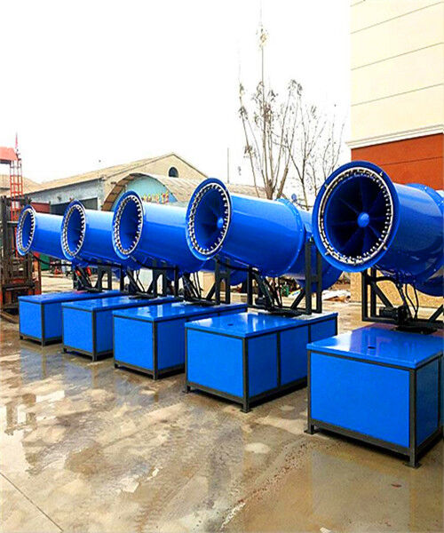 除塵噴霧炮是根據(jù)送風(fēng)原理,先使用進(jìn)口高壓泵、微細(xì)霧化噴嘴將水霧化,利用風(fēng)機(jī)風(fēng)量和風(fēng)壓將霧化后的水霧送到較遠(yuǎn)距離,使得水霧到達(dá)較遠(yuǎn)距離能夠覆蓋大面積,水霧與粉塵凝結(jié)后降落,從而達(dá)到降塵目的。