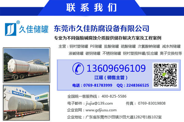 東莞市久佳防腐設備有限公司主要生產久佳防腐鋼襯塑儲罐、管口一體成型PE儲罐、碳鋼儲罐、不銹鋼儲罐、反應釜攪拌罐、離子交換柱、鹽酸/硫酸/酸堿儲罐等五大材質100多種規(guī)格,規(guī)模和產品質量在國內同行處于優(yōu)勢地位。
