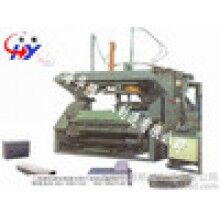 靜停養(yǎng)護(hù)達(dá)到切割強(qiáng)度后,模框由翻轉(zhuǎn)行車吊運(yùn)至切割機(jī)工位上,翻轉(zhuǎn)吊具將模框翻轉(zhuǎn)90°放在切割小車支座上,然后由翻轉(zhuǎn)吊具機(jī)械手自動(dòng)開啟??颉⒚撃?,把坯體連同側(cè)板側(cè)立在第一輛切割小車上,脫下的??蚯謇砗笈c蒸養(yǎng)返回的經(jīng)清理噴油后的側(cè)板組合成模具,等待澆注。在組模的同時(shí),脫模后的坯體在切割機(jī)上分部做定點(diǎn)切割,首先第一輛切割小車帶動(dòng)坯體行走經(jīng)過縱切裝置進(jìn)行縱向切割,坯體在進(jìn)行縱向切割時(shí),分別由切割刀片和由汽缸張緊的切割鋼絲同時(shí)完成側(cè)面、面包頭及頂面廢料的切割與清理,縱切結(jié)束后,切割小車?yán)^續(xù)行走至橫切裝置中央位置停止,橫切架自上而下垂直降落進(jìn)行坯體的橫向切割,橫切時(shí)切割鋼絲作鋸裝擺動(dòng),完成坯體的鋸裝橫向切割。坯體切割完成后,人工推鏟出去頂部面包頭。小車置換裝置啟動(dòng),由切割機(jī)下方小車置換油缸將切割好的坯體連同側(cè)板頂起,下方第一輛小車返回起始位置,去承載新的帶切割的坯體,第二輛小車替換第一輛小車位置,并承載坯體及側(cè)板行走至預(yù)定位置,最后坯體由半成品吊車連同地板吊運(yùn)至釜前蒸養(yǎng)小車上,在軌道上進(jìn)行編組。