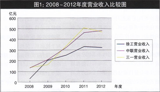 圖4 2008~2012年徐工、中聯(lián)、三一年度主營構(gòu)成圖