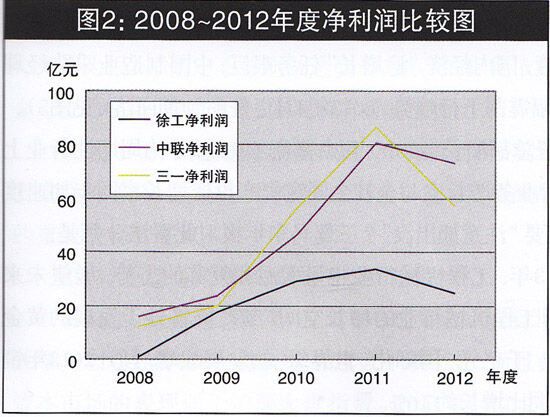 公司的成長與盈利能力正相關(guān)。在年報中,主營業(yè)務(wù)收入增長率、凈利潤增長率、凈資產(chǎn)增長率以及凈資產(chǎn)收益率、毛利率、凈利率等財務(wù)指標(biāo),是判斷企業(yè)成長性和盈利能力的重要指標(biāo)。表2顯示,三駕馬車中,5年主營業(yè)務(wù)收入同比增長率實現(xiàn)連續(xù)5年正增長、連續(xù)三年保持30%以上增長率的公司是中聯(lián),五年中增長率振幅最大的公司是徐工,2012年徐工和三—主營業(yè)務(wù)收入增長率均出現(xiàn)負(fù)增長;表2還顯示,凈利潤同比增長率方面,沒有—家公司連續(xù)五年正增長,2012年三駕馬車同時出現(xiàn)負(fù)增長,三一錄得-34.26%的最大降幅。在大環(huán)境不利因素作用下,公司成長性受到嚴(yán)峻挑戰(zhàn)(見圖2)。