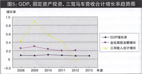 周期性行業(yè)受周期制約的特點,決定周期性行業(yè)要避免誤判宏觀經(jīng)濟發(fā)展趨勢,才能健康發(fā)展。5年來,三駕馬車—直在擴張產(chǎn)能,在經(jīng)濟下行壓力加大、GDP增長率持續(xù)回落的宏觀背景下,主要財務(wù)指標(biāo)必然加速度回落(見圖4)。面對如此局面,要保持增長勢頭,就必須準(zhǔn)確判斷宏觀經(jīng)濟趨勢,調(diào)整企業(yè)發(fā)展戰(zhàn)略。三駕馬車,是如何判斷宏觀經(jīng)濟發(fā)展趨勢的呢?