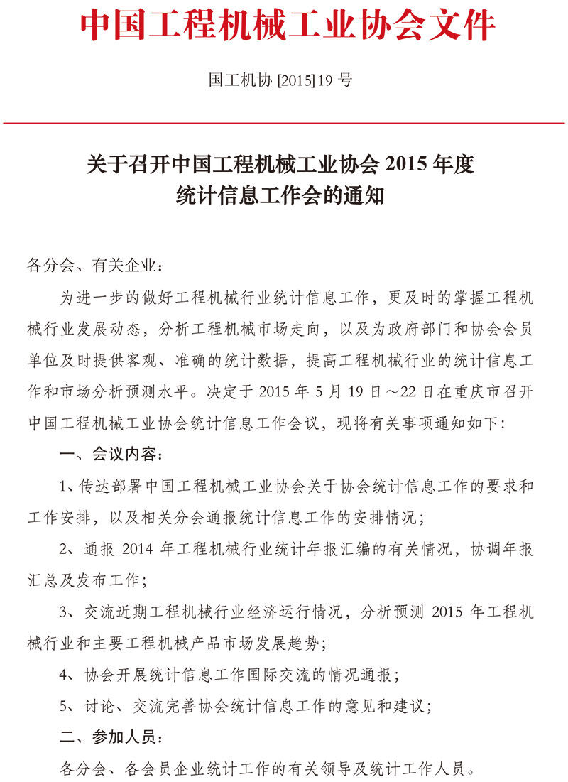 關(guān)于召開(kāi)中國(guó)工程機(jī)械工業(yè)協(xié)會(huì)2015年度統(tǒng)計(jì)信息工作會(huì)的通知