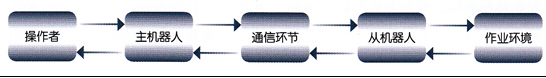 工程機(jī)器人研究的現(xiàn)狀表明,由于受到機(jī)構(gòu)、控制、傳感器以及人工智能水平的限制,研究出能在未知環(huán)境中全自主方式工作的機(jī)器人是目前難以實(shí)現(xiàn)的目標(biāo)。因此,目前在核工業(yè)、搶險(xiǎn)救災(zāi)等高危、惡劣的環(huán)境中被廣泛應(yīng)用的是遙操作機(jī)器人。遙操作機(jī)器人主要分為視覺臨場(chǎng)感遙操作機(jī)器人、力覺臨場(chǎng)感遙操作機(jī)器人、觸覺臨場(chǎng)感遙操作機(jī)器人及運(yùn)動(dòng)覺臨場(chǎng)感遙操作機(jī)器人等。基于臨場(chǎng)感的遙操作機(jī)器人系統(tǒng)原理如圖3所示,它由操作者、主機(jī)器人(手控器)、通訊環(huán)節(jié)、從機(jī)器人和作業(yè)環(huán)境5部分構(gòu)成。在臨場(chǎng)感系統(tǒng)工作過(guò)程中,由操作者向主機(jī)器人發(fā)出操作命令(如位置指令)操作主機(jī)器人運(yùn)動(dòng),主機(jī)器人的運(yùn)動(dòng)信息通過(guò)通訊環(huán)節(jié)傳給遠(yuǎn)方的從機(jī)器人,從而控制從機(jī)器人的運(yùn)動(dòng);當(dāng)從機(jī)器人同環(huán)境交互時(shí),從機(jī)器人的運(yùn)動(dòng)信息(如視覺、力覺、觸覺等信息)又通過(guò)通訊環(huán)節(jié)反饋給本地主機(jī)器人,使操作者對(duì)于現(xiàn)場(chǎng)作業(yè)情況有了有效的感知,從而能夠及時(shí)做出準(zhǔn)確判斷,發(fā)出相應(yīng)的操作命令,控制遠(yuǎn)方從機(jī)器人準(zhǔn)確、高效地完成作業(yè)任務(wù)。目前,基于視覺臨場(chǎng)感的工程機(jī)器人遙操作控制主要是用攝像機(jī)獲取現(xiàn)場(chǎng)的視頻圖像并回傳到主控端,操縱者通過(guò)監(jiān)視器來(lái)完成對(duì)工程機(jī)器人的操作任務(wù)。